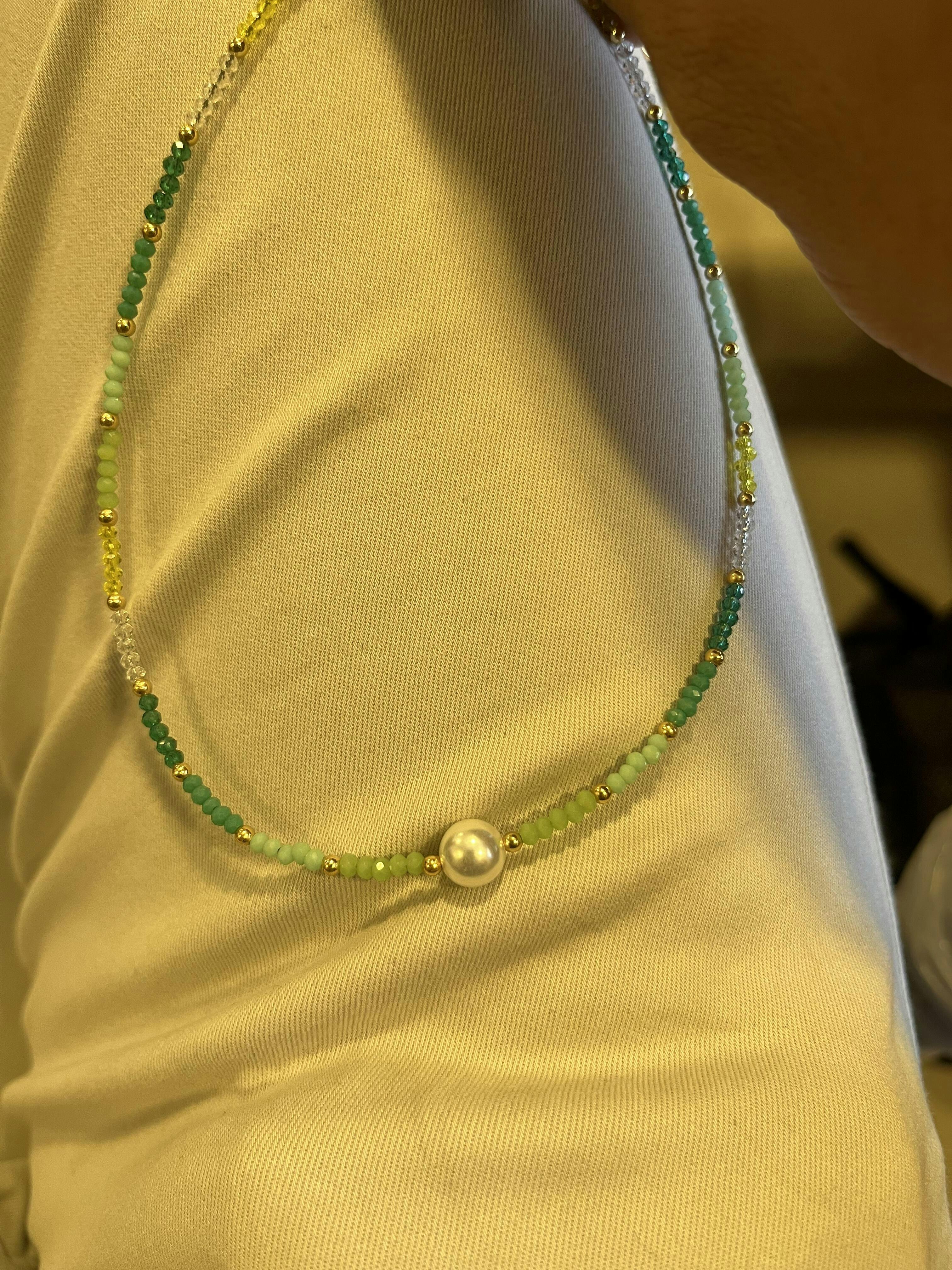 This vibrant necklace features green, blue, and yellow beads with a pearl centerpiece, all gold-plated. Perfect for modern girls, style it with a sleek dress or casual chic ensemble.